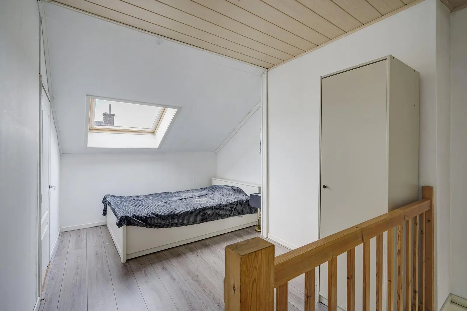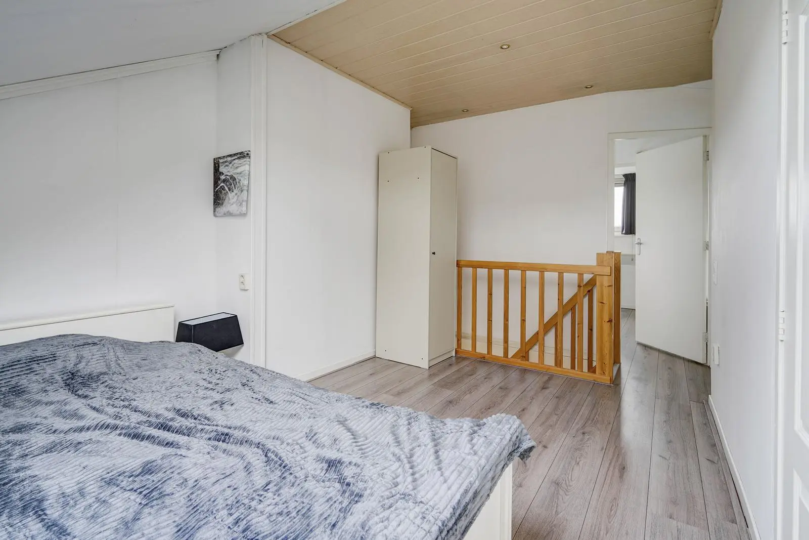 De gesloten moderne keuken is voorzien van diverse inbouwapparatuur, waaronder een vaatwasser, koel-vriescombinatie, kookplaat met afzuigkap, oven en een losse magnetron. De slaapverdieping is bereikbaar via een trap in de eetkamer. De ruime overloop, momenteel in gebruik als hoofdslaapkamer, biedt toegang tot een praktische ingebouwde bergkast met onder andere de CV-ketel.