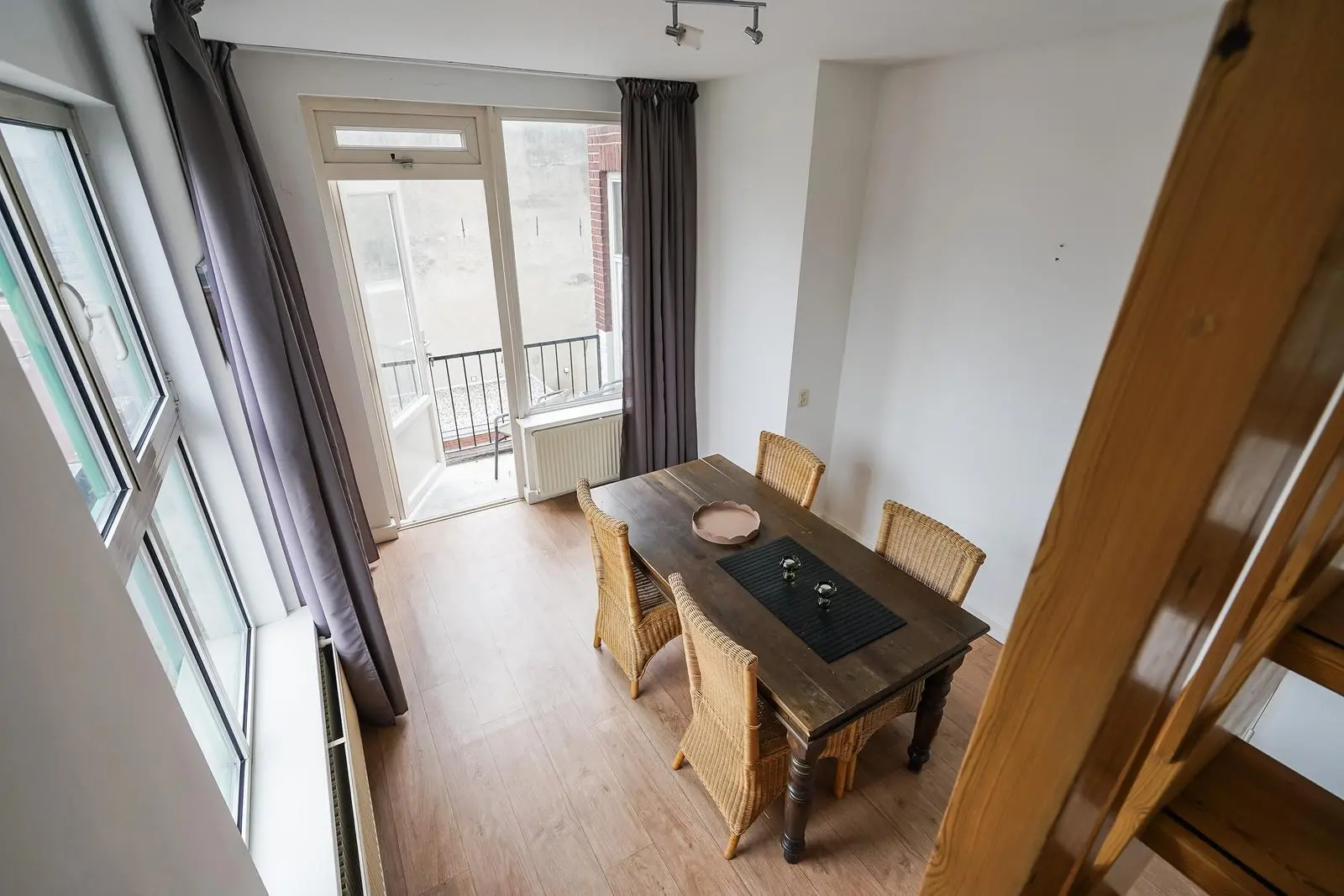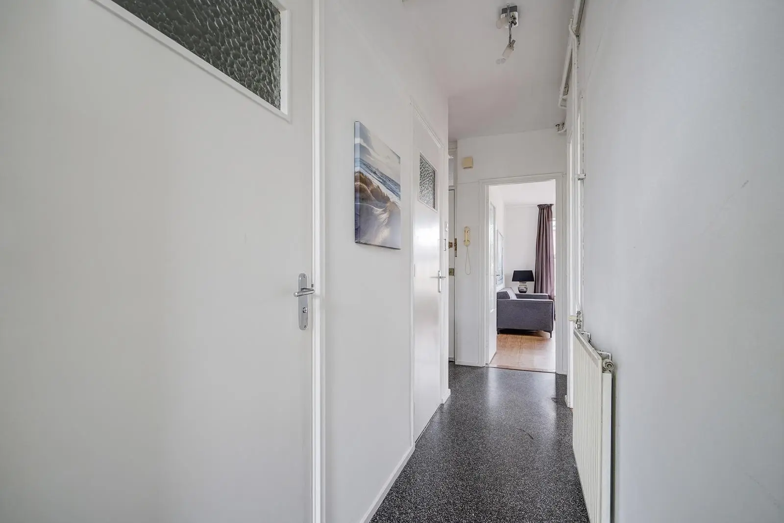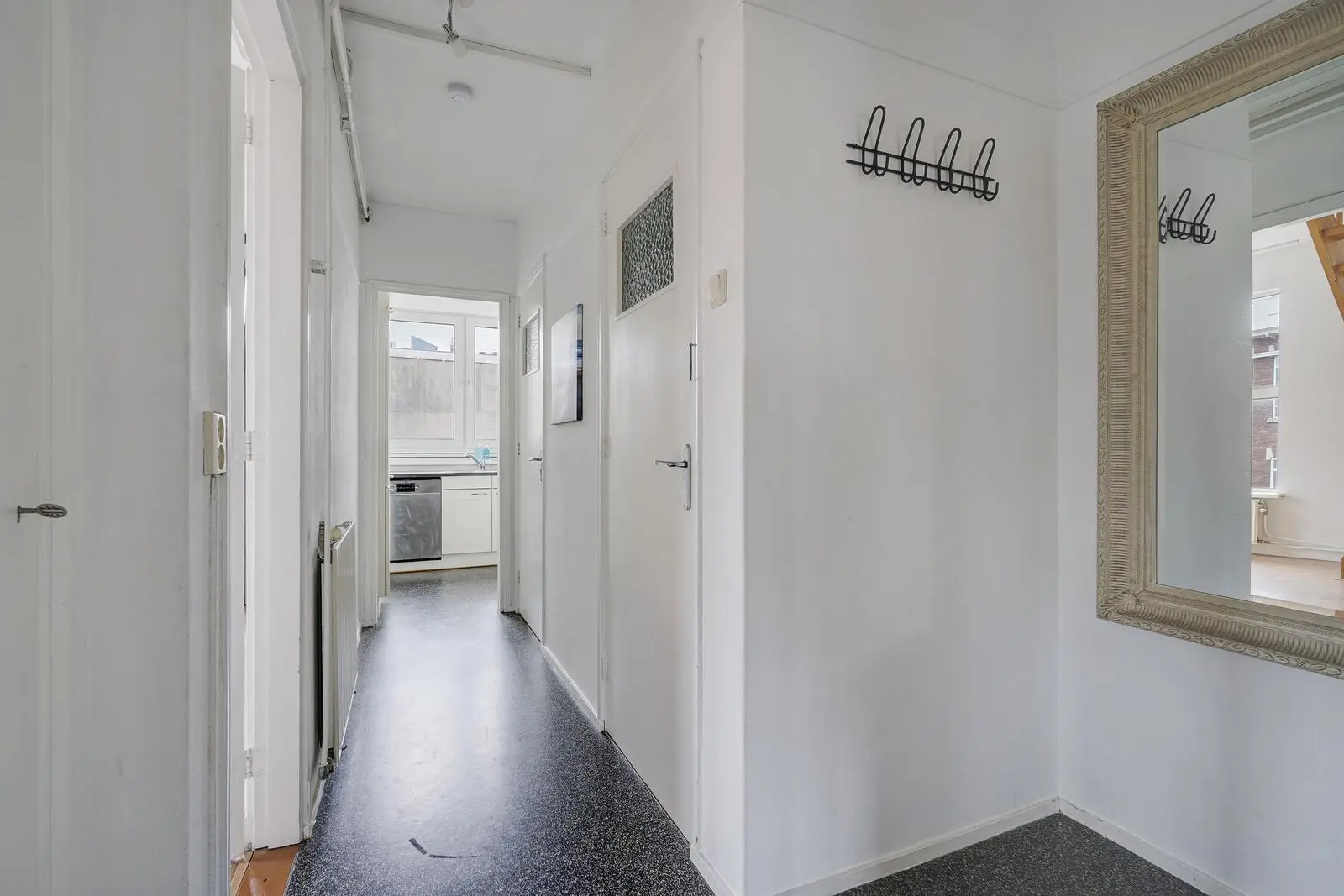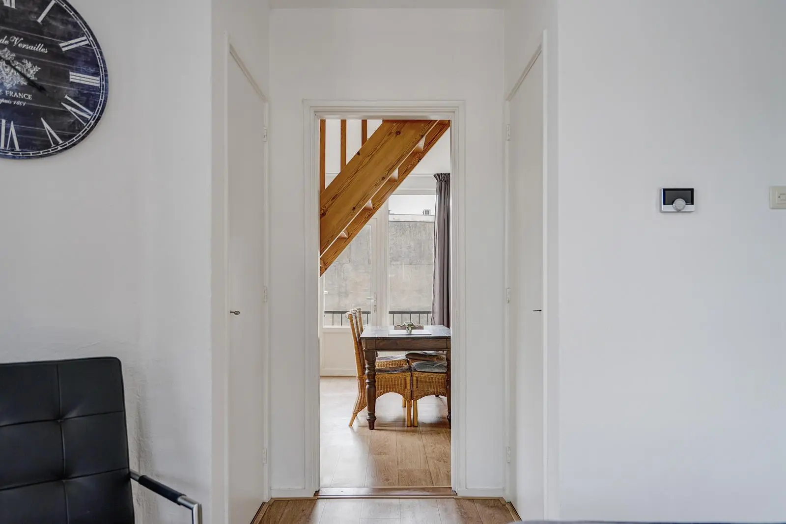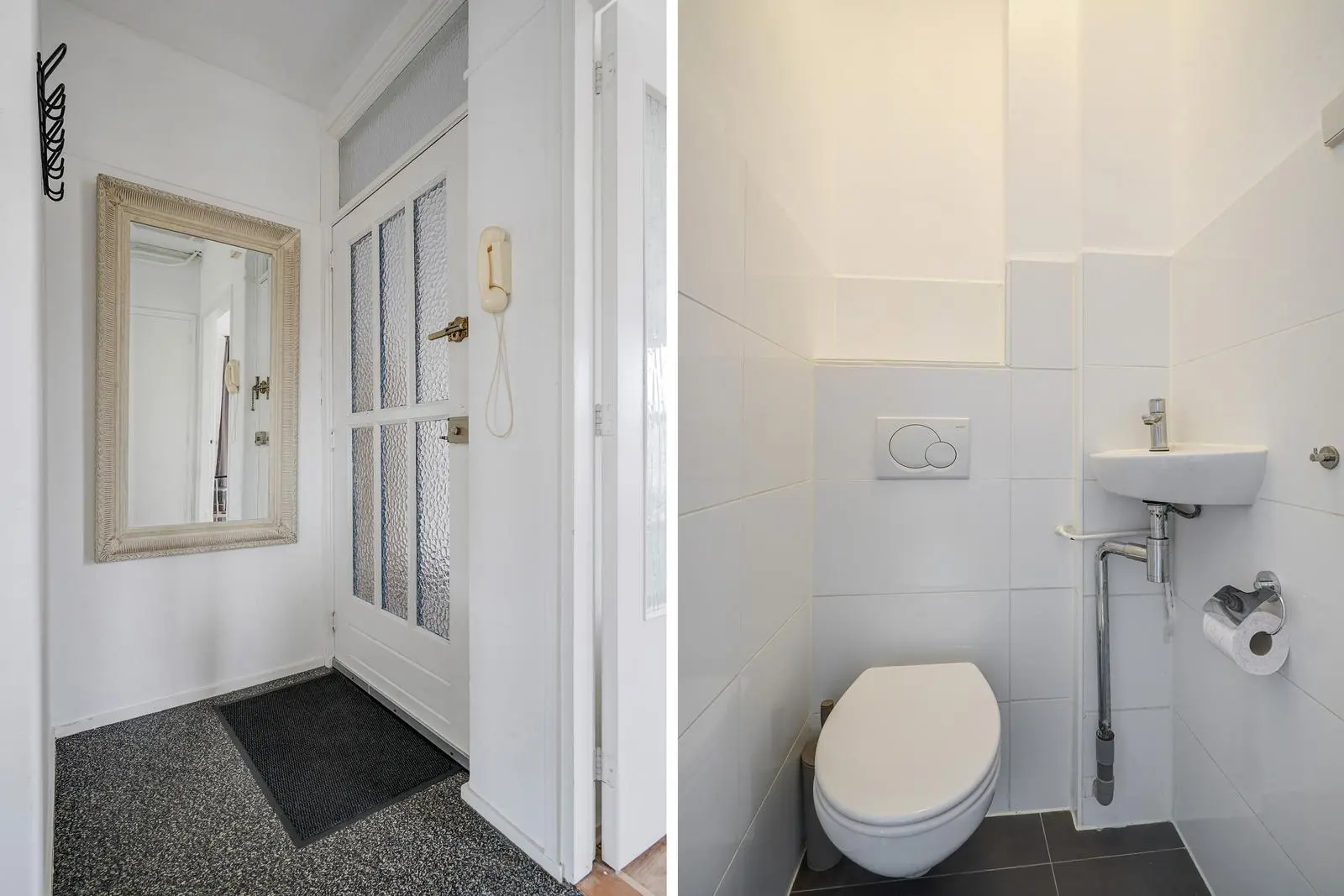 In de hal vind je een praktische inbouwkast met veel bergruimte en een wasmachine. Daarnaast is er een modern vrijhangend toilet met fonteintje. De lichte woonkamer, gelegen aan de voorzijde, profiteert van de hoekligging met ramen aan zowel de voor- als zijkant. Twee ingebouwde kasten bieden extra bergruimte. De achterkamer, momenteel in gebruik als eetkamer, is zowel vanuit de woonkamer als de hal bereikbaar en biedt toegang tot het balkon aan de achterzijde.