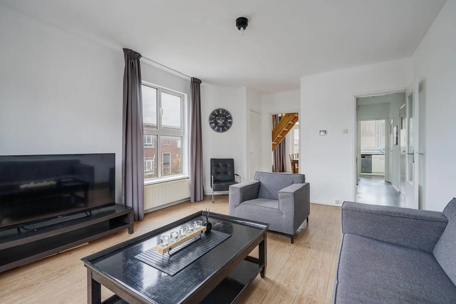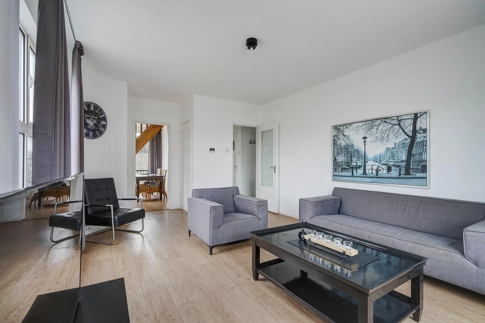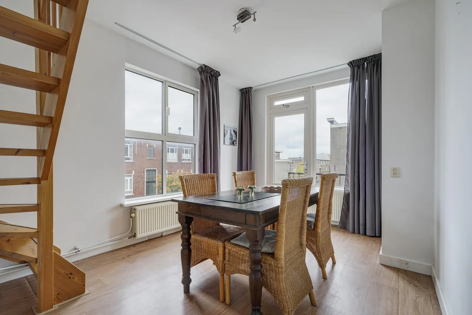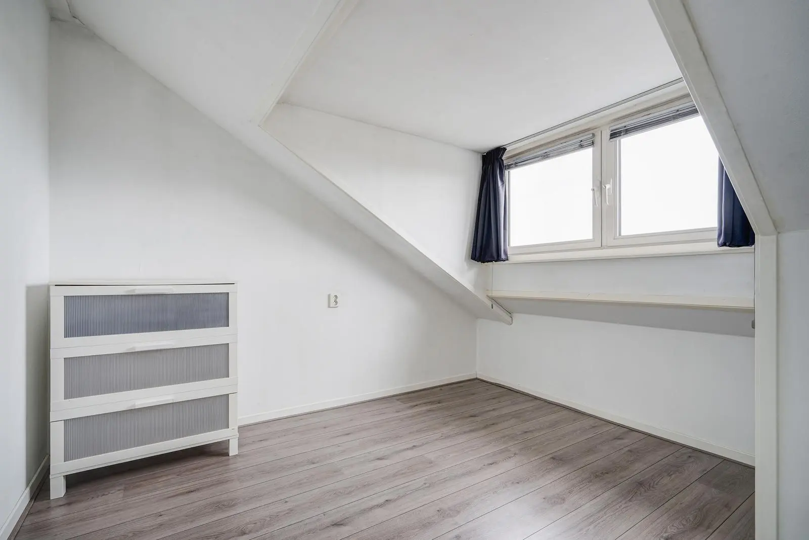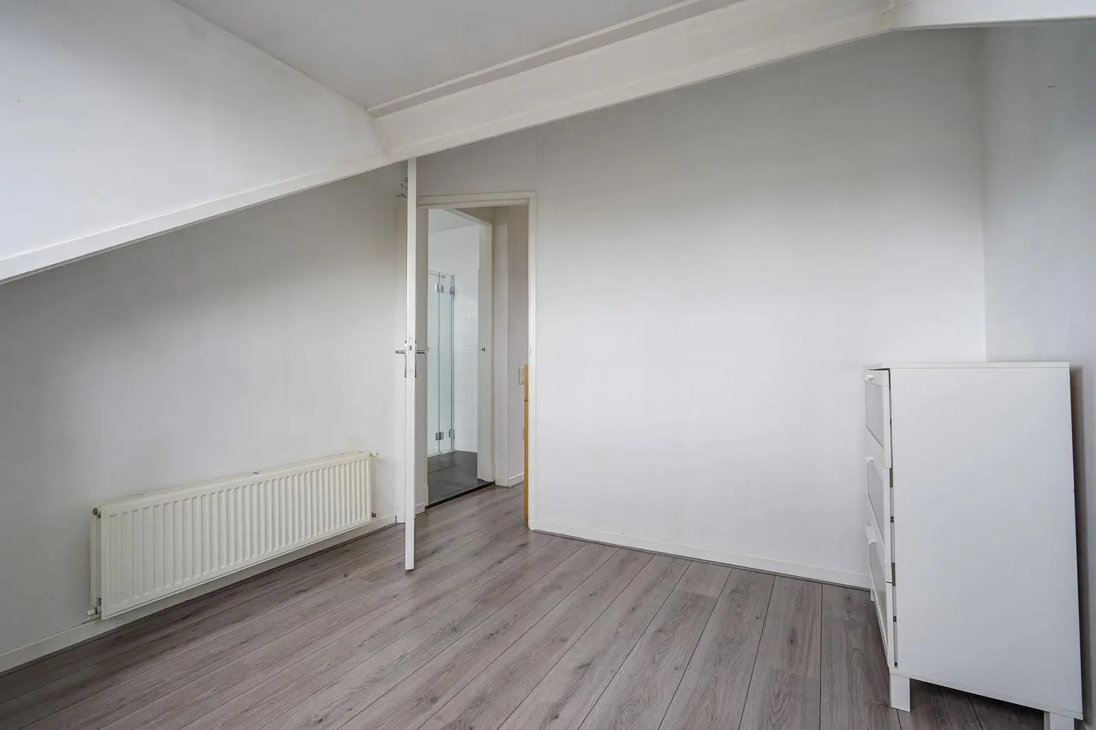 In de hal vind je een praktische inbouwkast met veel bergruimte en een wasmachine. Daarnaast is er een modern vrijhangend toilet met fonteintje. De lichte woonkamer, gelegen aan de voorzijde, profiteert van de hoekligging met ramen aan zowel de voor- als zijkant. Twee ingebouwde kasten bieden extra bergruimte. De achterkamer, momenteel in gebruik als eetkamer, is zowel vanuit de woonkamer als de hal bereikbaar en biedt toegang tot het balkon aan de achterzijde.