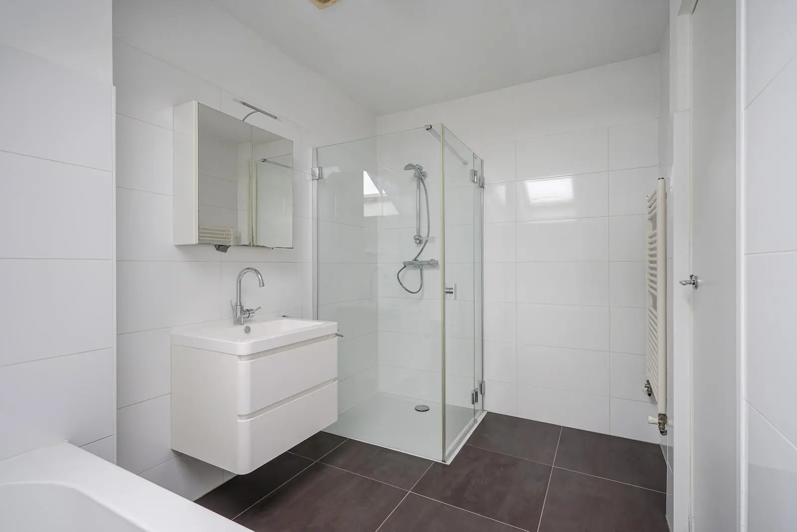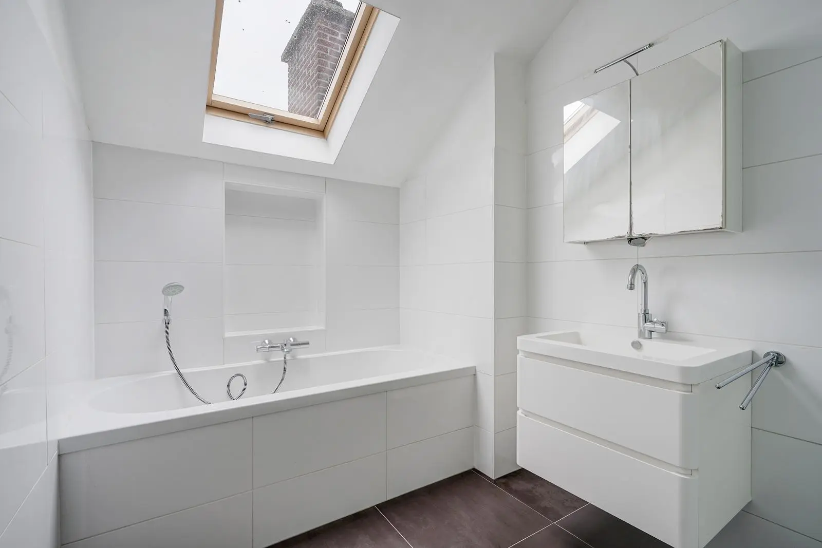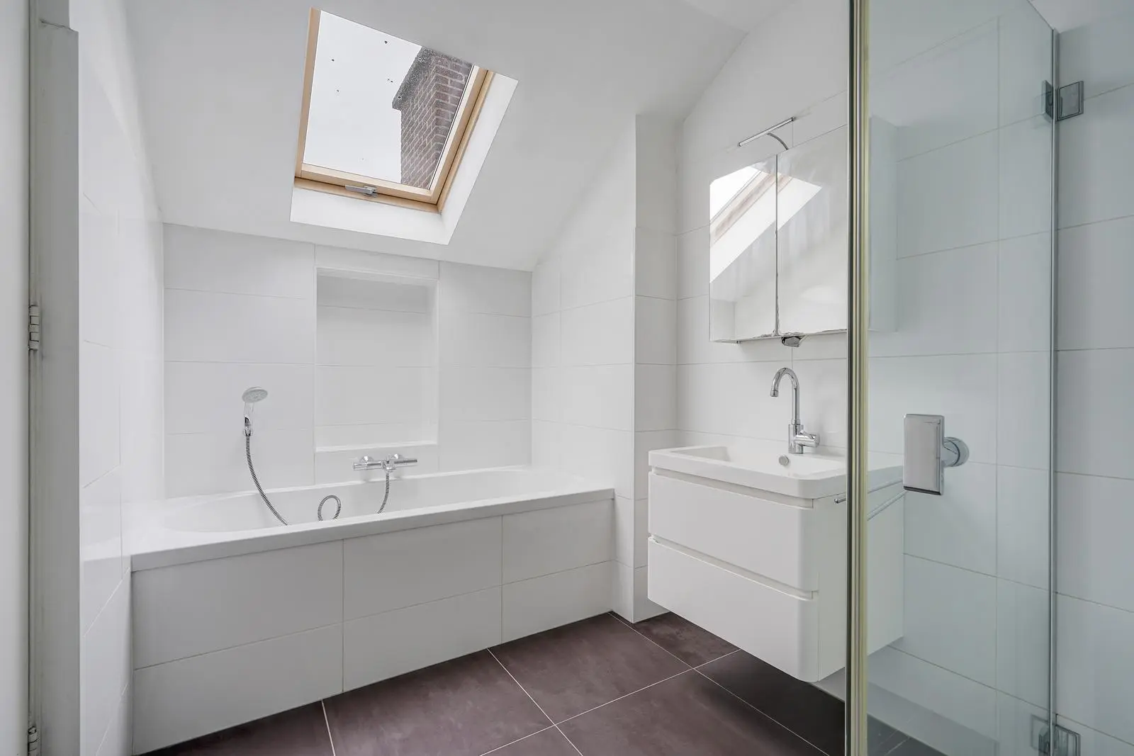 De ruime en moderne badkamer is uitgerust met een wastafelmeubel, ligbad en douche. Aan de achterzijde van deze verdieping bevindt zich een tweede slaapkamer, die naar eigen wens kan worden ingericht. Op de begane grond, achter het complex, is een privé fietsenberging beschikbaar.