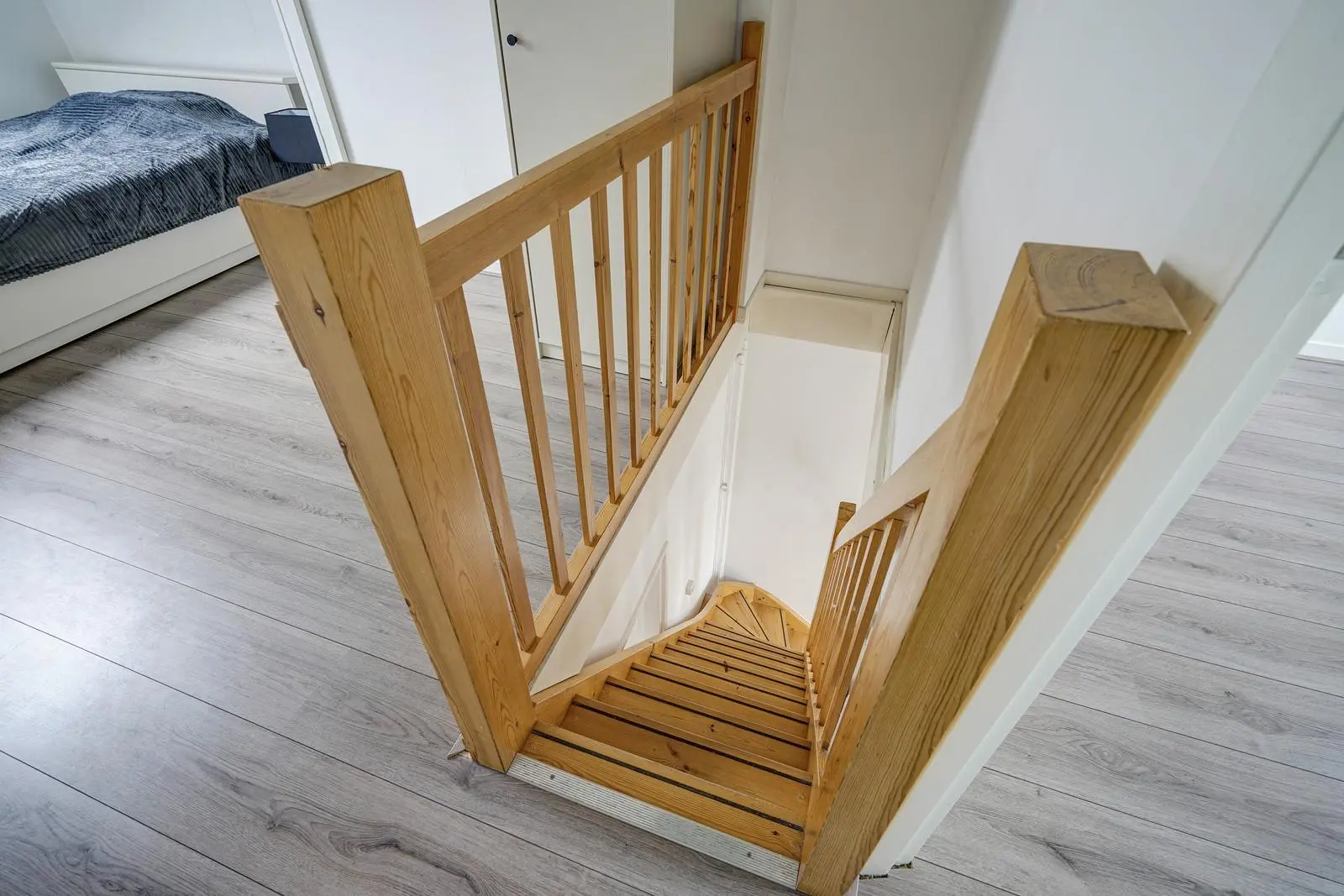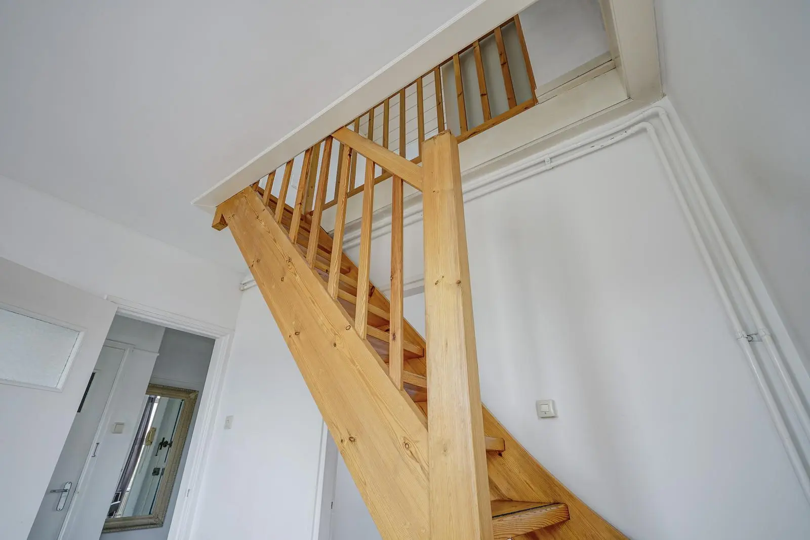 Een trap leidt naar de tweede etage, waar je het appartement binnenkomt via een L-vormige hal met garderobe.