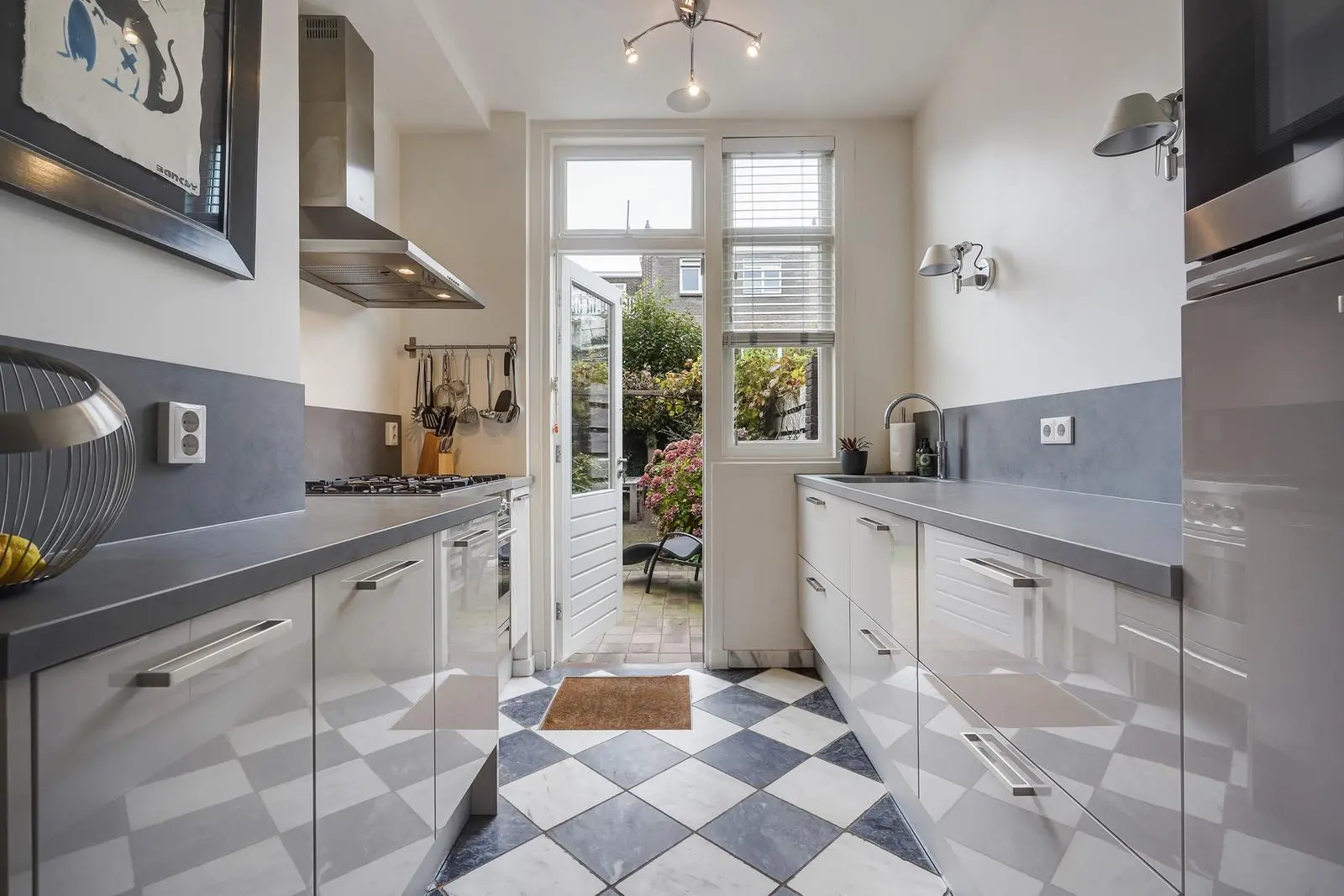 De entree geeft vanuit de vestibule met fraaie granieten vloer en originele wandtegels, via de tochtseparatie met glas-in-lood, toegang tot de centrale hal met granieten vloer, verdiepte trapkast en modern toilet met fonteintje. Vanuit de hal is de ruime zit-/eetkamer toegankelijk, voorzien van een prachtige afzelia-parketvloer met visgraatmotief, een gashaard en glas-in-lood. Openslaande deuren leiden naar de zonnige, ruime achtertuin met twee terrassen en houten berging. De hal leidt naar de luxe Bruynzeel-keuken met marmeren vloer, keramische werkbladen aan twee zijden en inbouwapparatuur (Miele-combi-oven, -vaatwasser en -koel-vriescombinatie, Boretti-gasfornuis en -afzuigkap, en Quooker). Onder de keuken bevindt zich een ruime kelderruimte met de opstelplaats voor de CV-ketel.