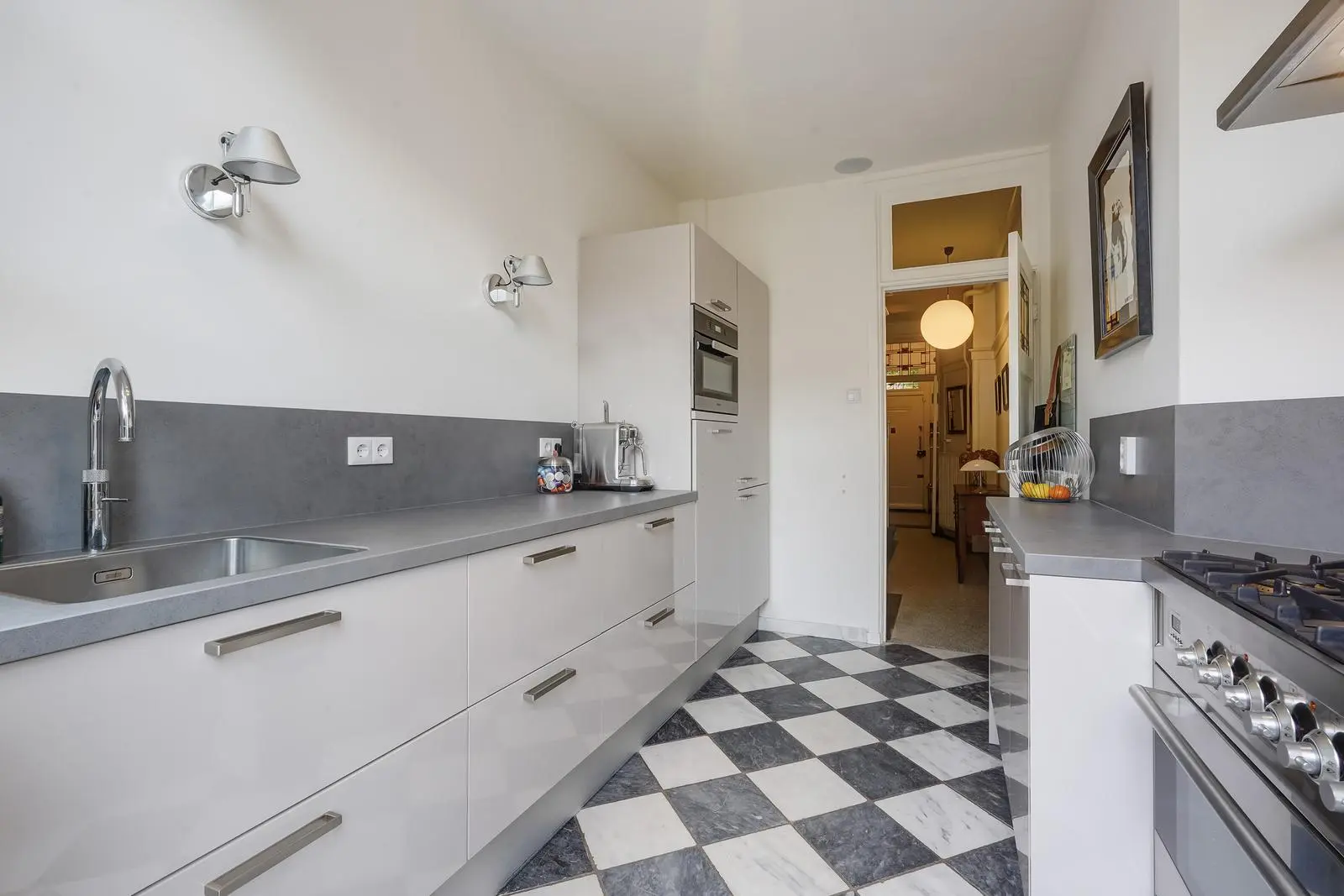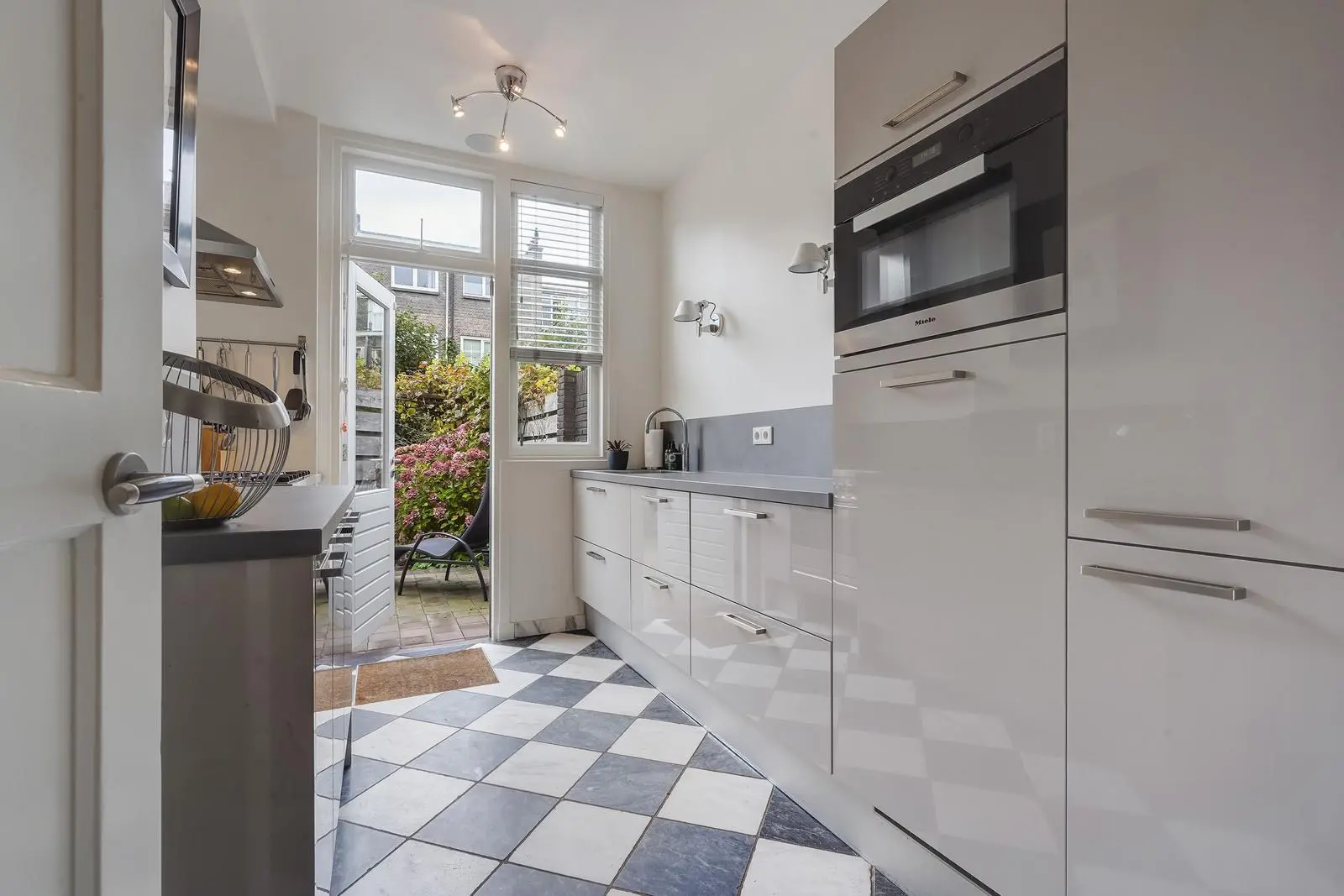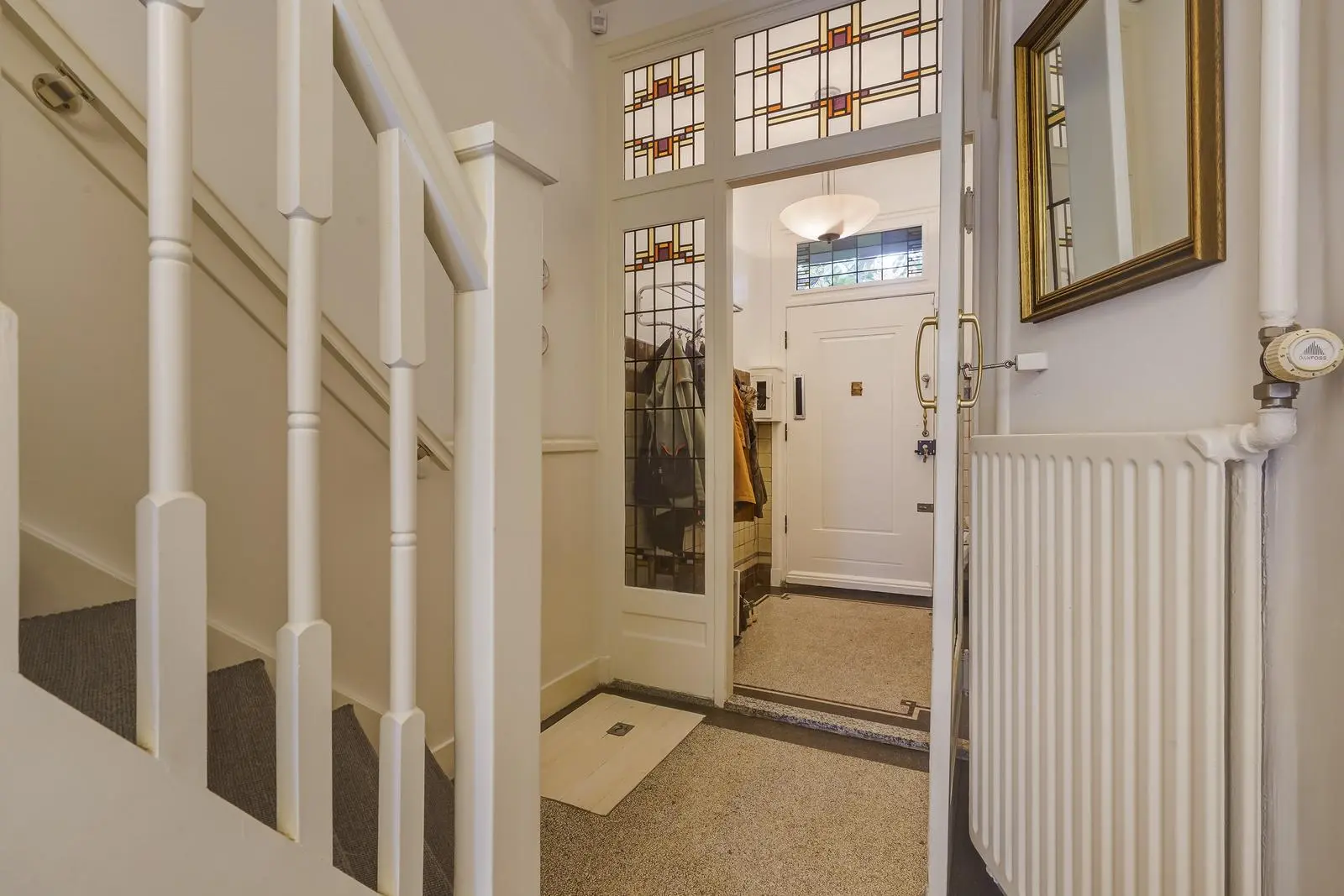The entrance leads from a vestibule with a beautiful granite floor and original wall tiles through a stained-glass door to the central hallway, also with granite flooring and a deep under-stairs cupboard. From the hallway, you enter the spacious living and dining room, featuring an elegant Afzelia herringbone parquet floor, a gas fireplace, and stained-glass windows. French doors open onto the sunny, generous back garden with two terraces and a wooden shed. The hallway also provides access to the luxurious kitchen, finished with a marble floor, ceramic countertops on both sides, and high-end built-in appliances including a Miele combination oven, dishwasher, and fridge-freezer, a Boretti gas stove with extractor hood, and a Quooker boiling-water tap. Beneath the kitchen is a basement housing the central heating system. A modern guest toilet with wash basin is also accessible from the hallway.