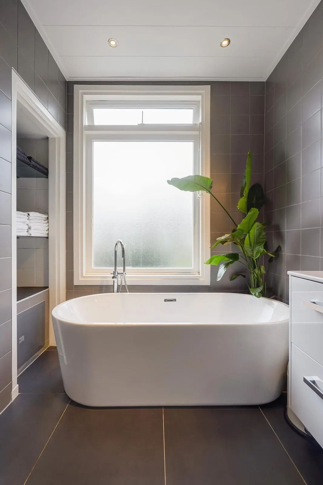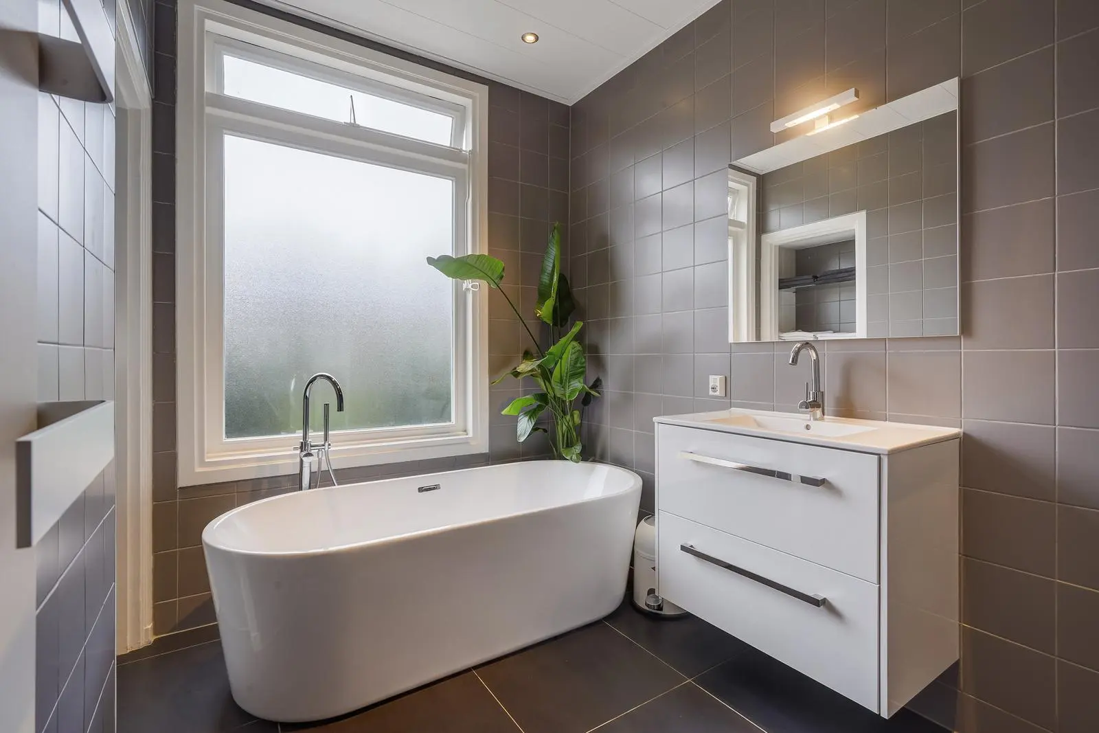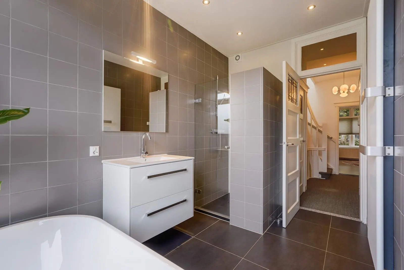 The spacious, modern bathroom features a freestanding bathtub, wash basin with vanity unit, designer radiator, and walk-in shower. A separate modern toilet is accessible from the landing.