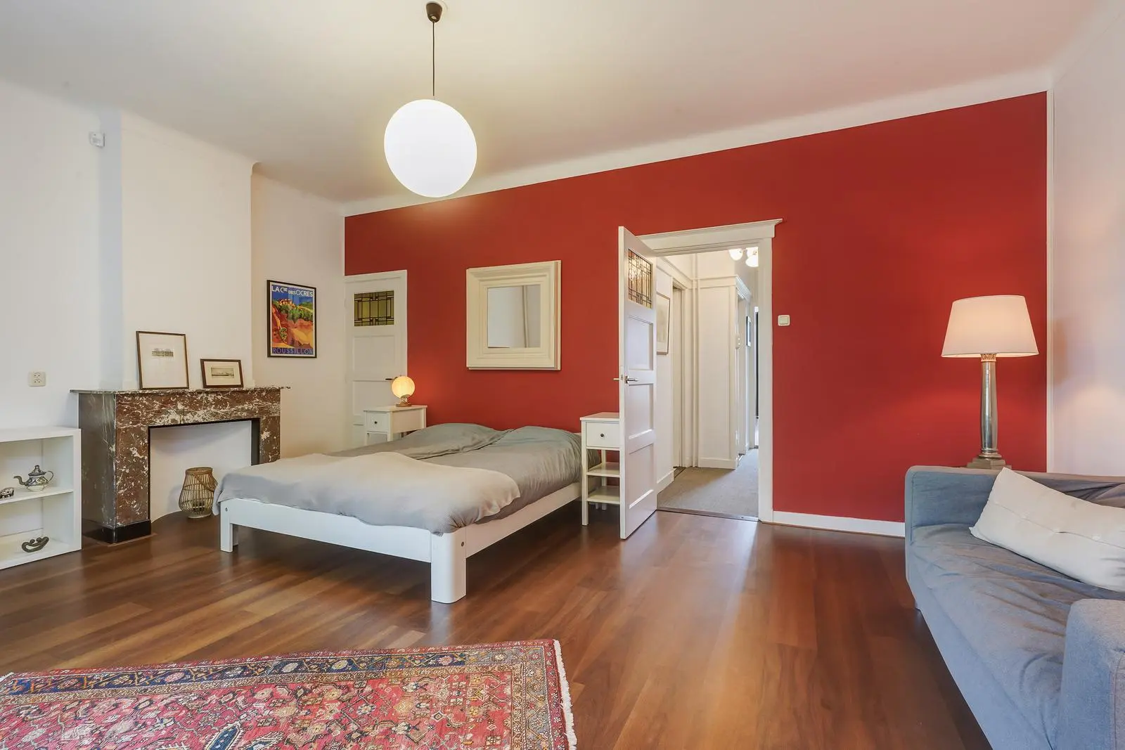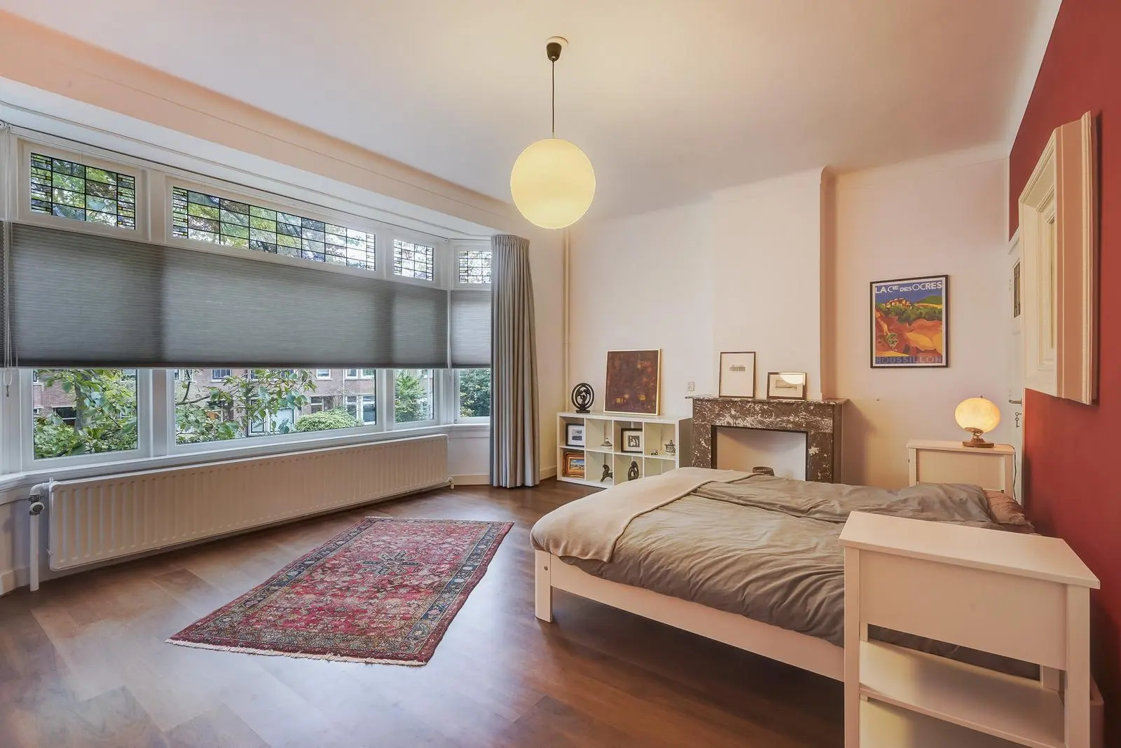 The landing leads to a charming, full-width front bedroom with decorative fireplace and stained-glass details. The rear bedroom, also with fireplace, has French doors opening onto a balcony. Between the bedrooms is a convenient walk-in wardrobe.