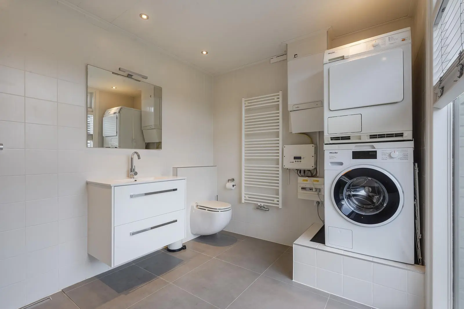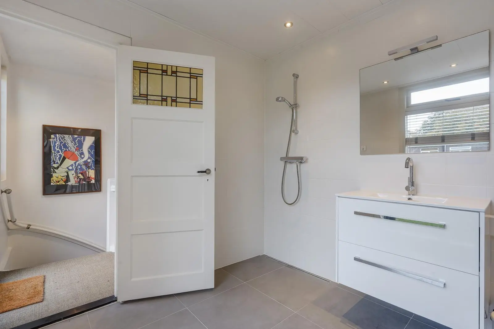 The second-floor landing gives access to a large front bedroom spanning the full width of the house, as well as to a second modern bathroom with walk-in shower, wash basin with cabinet, designer radiator, toilet, and washing machine connection.
